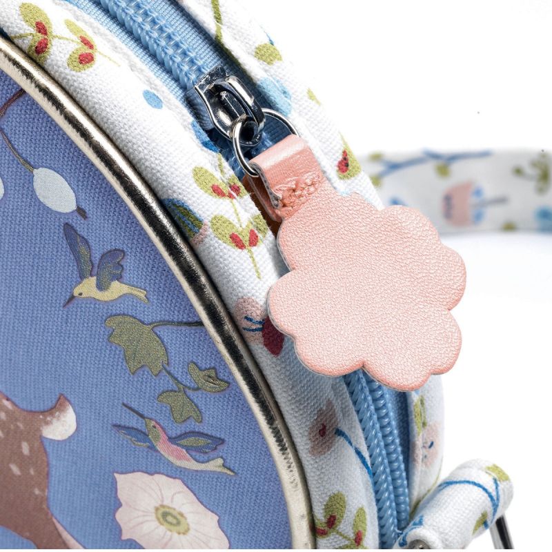 Denne farverige runde taske er slet ikke til at stå for. Tasken har motiv af det sødeste dådyr og har indstillelig rem og mange detaljer, bl.a. en robust lynlås.