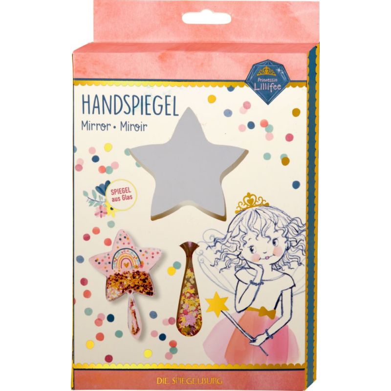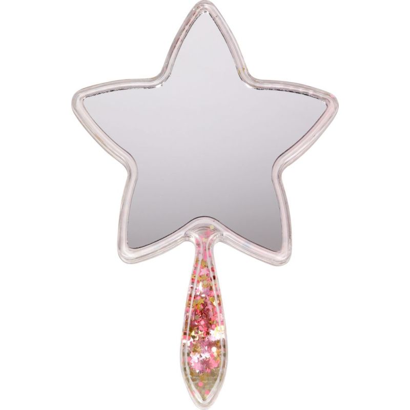Dette specielle stjerneformede håndspejl er dekoreret med bevægelige glitterpalietter. Spejlet er lavet i glas, og håndtaget er beregnet til små pigehænder.