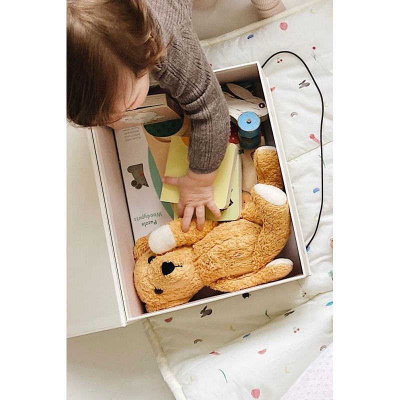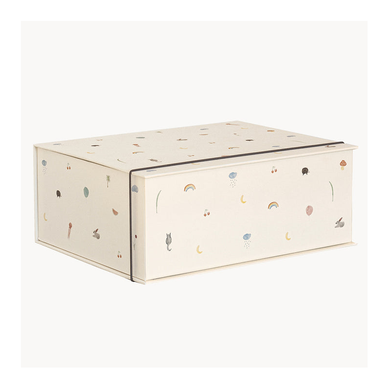 Opbevaringsæsken er FSC certificeret og har håndmalede akvarelillustrationer på cremefarvet baggrund. Den har en praktisk elastik for at sikre nem åbne og lukke funktion.