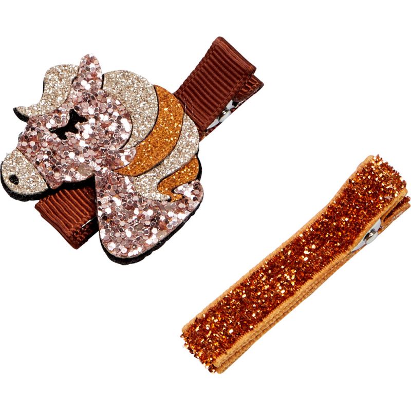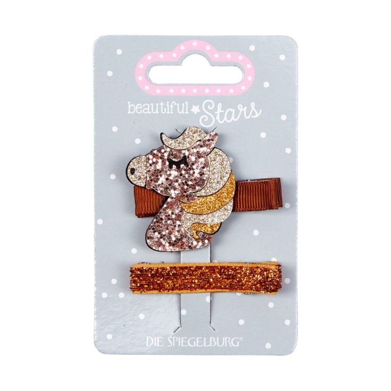 Det ene søde spænde består af en Brun beautiful Star hest, og det andet spænde er fyldt med masser af glimmer og vil være prikken over íet til et flot outfit.