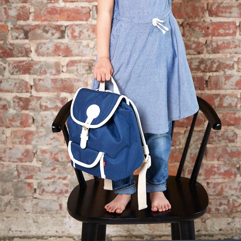 Den Marineblå børnerygsæk er fremstillet i kraftig polyester, der både er slidstærkt og vandafvisende. Den har et stort rum, der rummer 6 liter, og som lukkes med en hvid snor (meget old school) der passer til kantbåndene.