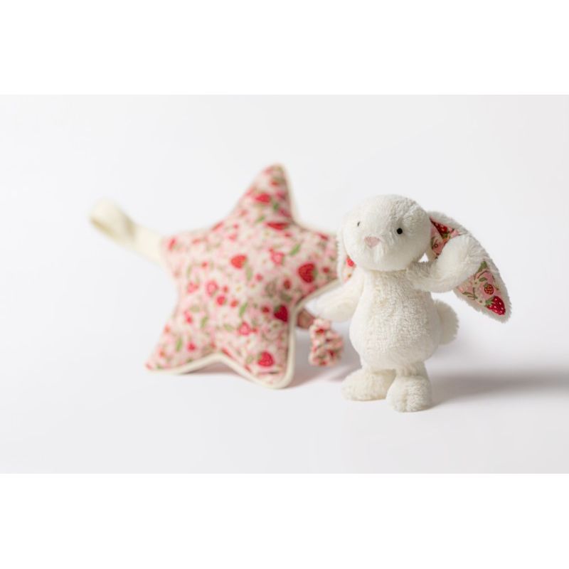 Denne nuttede Strawberry kanin bamse fra Baby Jellycat hænger i en fin stjerne.