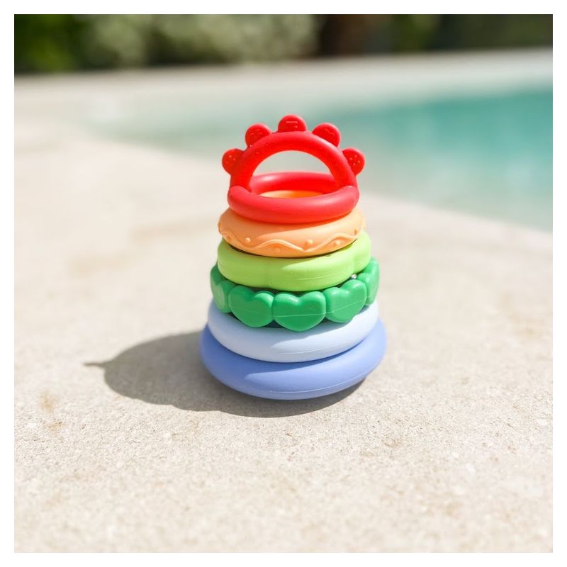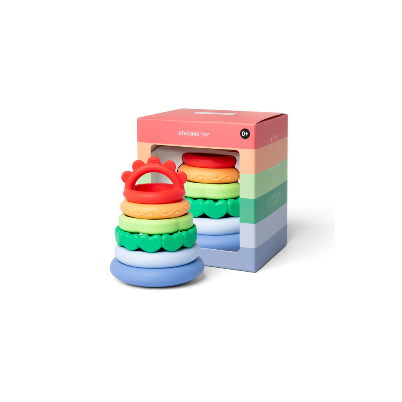 I vores web-shop og i vores fysiske butik Banditten på Østerbrogade 138 har vi et stort udvalg i stable legetøj, og her kan vi præsentere et flot stabletårn i regnbuens nuancer lavet i silicone helt fri for BPA, Latex, PVC og Phthalater.