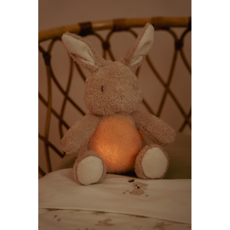 "En ven til søde drømme. Kramme kaninen Bunny med lys og lyd giver kærlighed, trøst og tryghed med sin blide glød og beroligende lyde, f.eks. en blød melodi, hjerteslag og livmoderlyde. Den søde kanin hjælper den lille med at slappe af og falde i søvn, og den er lavet af kært, blødt stof. En trøstende følgesvend både dag og nat."