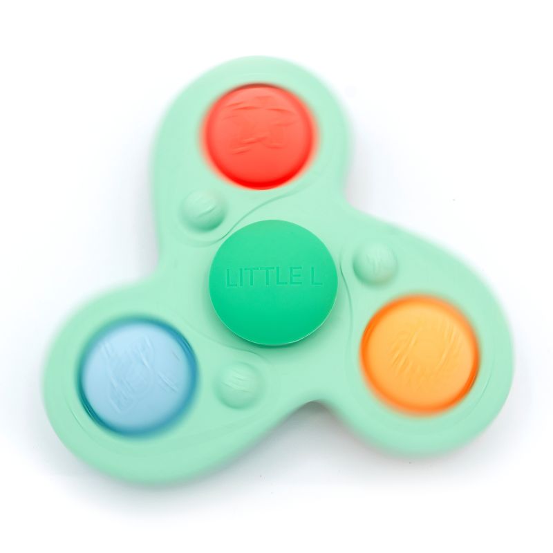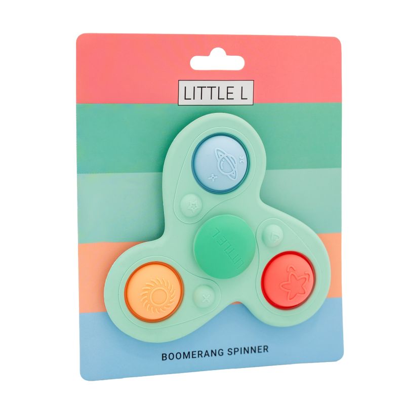 Denne farverige Boomerang Spinner fra Little L bliver hurtigt et lille sansehit i hjemmet. Den bløde silikone frister små fingre til at trykke, mærke og undersøge de fine pop-it bobler, mens spinneren drejer i rolige, hypnotiske bevægelser, der hjælper barnet med at opdage årsag og virkning på en legende måde. De små symboler – sol, planet og stjerne – inviterer til nysgerrighed og små fortællinger i legen, og de behagelige teksturer stimulerer sansningen, hver gang barnet rører ved spinneren.