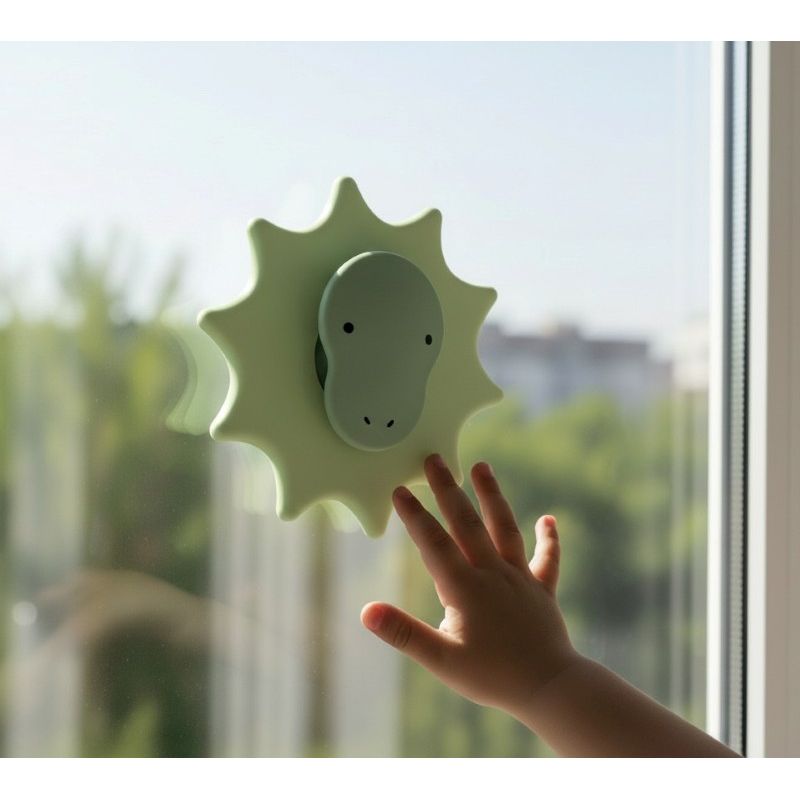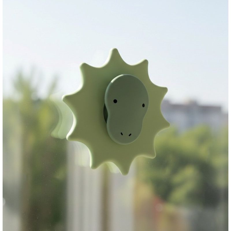 Barnet kan trykke, dreje og undersøge den igen og igen, og spinneren sidder fast på glatte overflader med en stærk sugekop, så den er perfekt ved højstolen, i badet, på vinduet eller med i barnevognen på små eventyr. De bløde takker giver taktil stimuli og inviterer barnet til at gå på opdagelse i former og følelser, mens den venlige dinosaur-snude skaber tryghed og små smil.