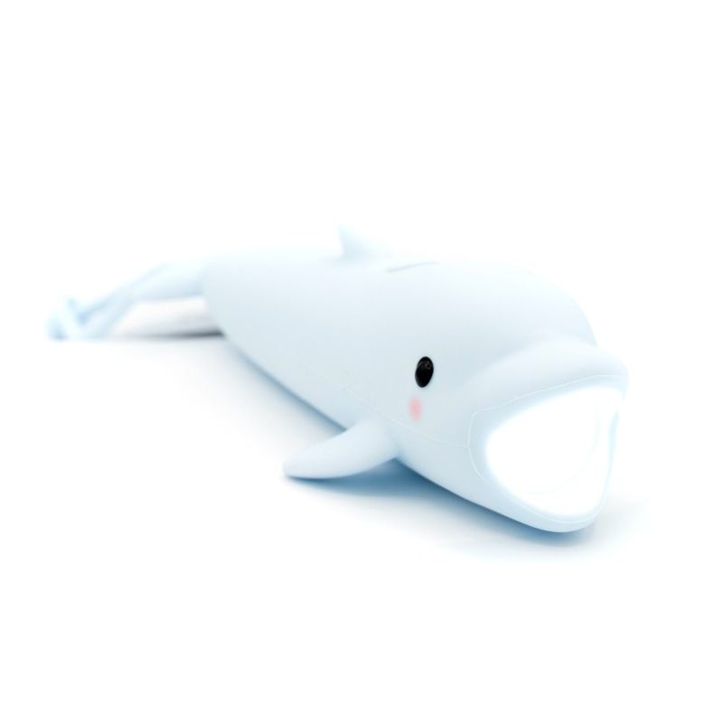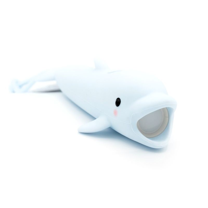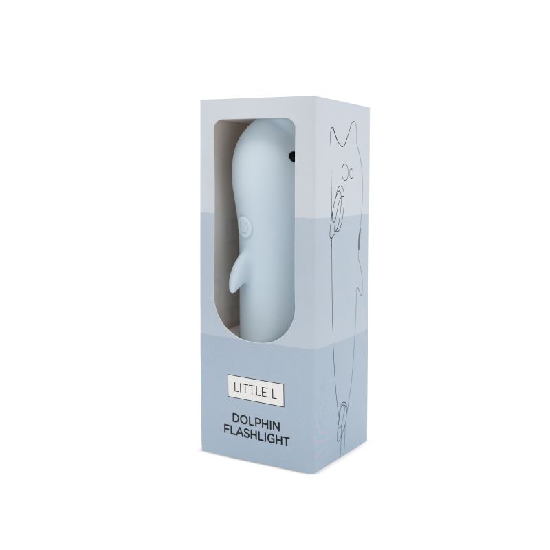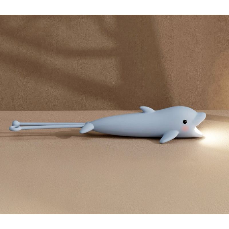 Lommelygten har et lyst blødt lys, der kommer ud af delfinens mund, når man trykker den på ryggen. Lommelygten er dejlig at holde om med den bløde silokoneoverflade.