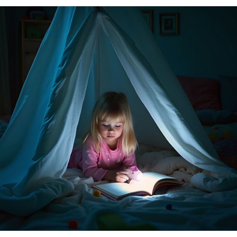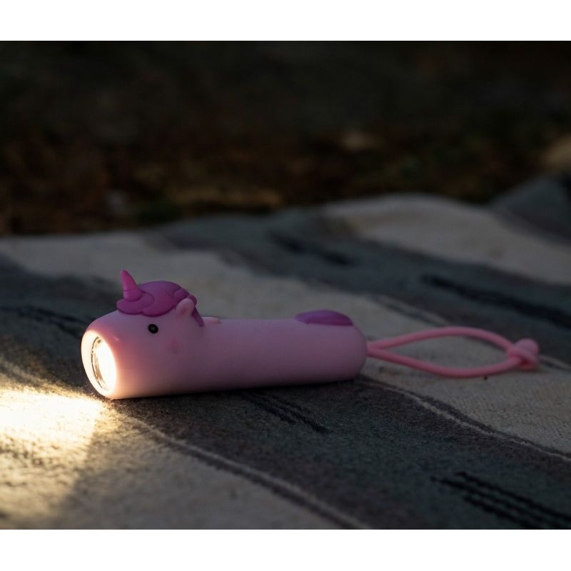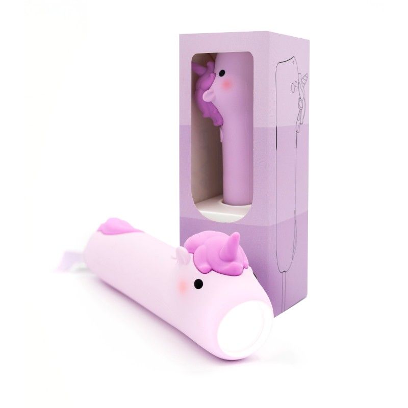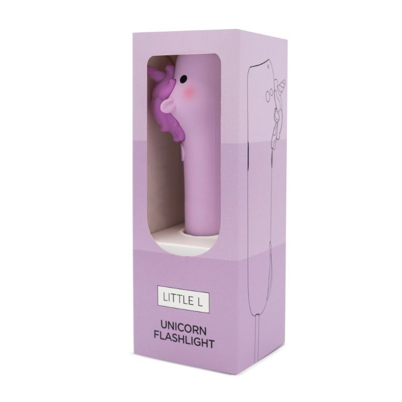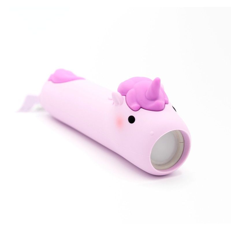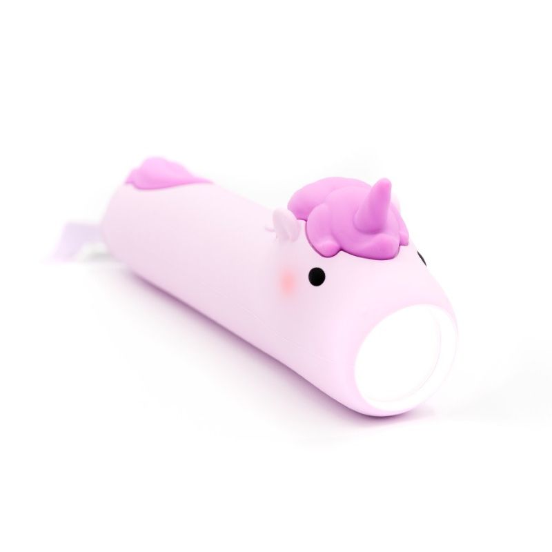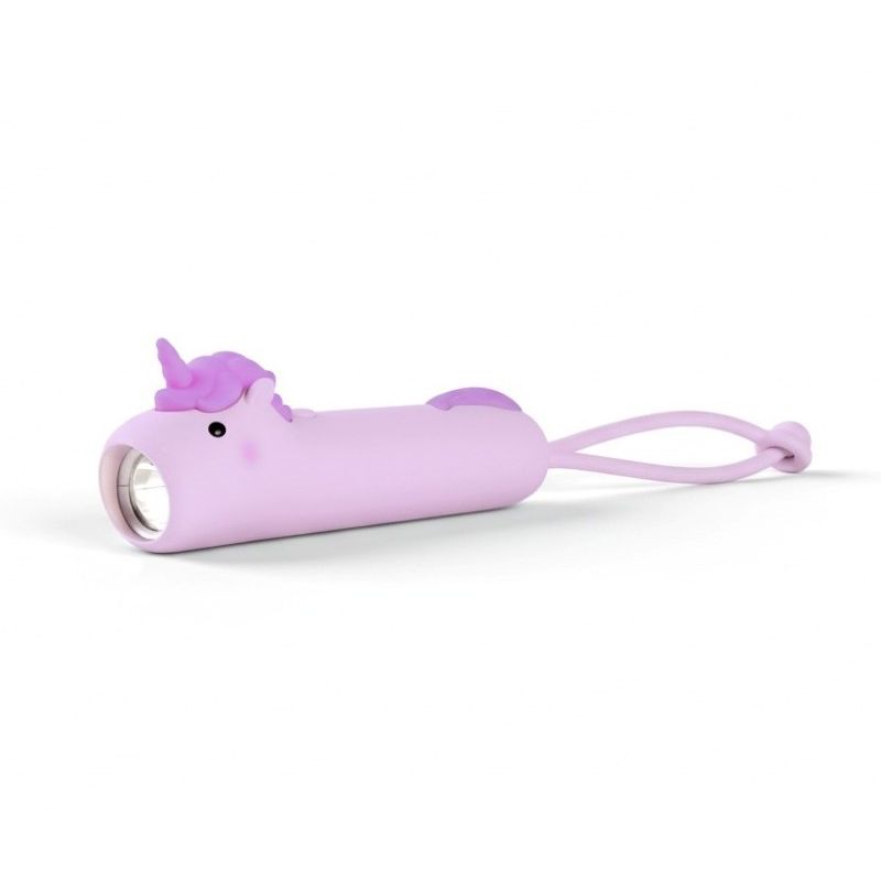 Lommelygten har et lyst blødt lys, der kommer ud af enhjørningens mund, når man trykker den på ryggen. Lommelygten er dejlig at holde om med den bløde silokoneoverflade.