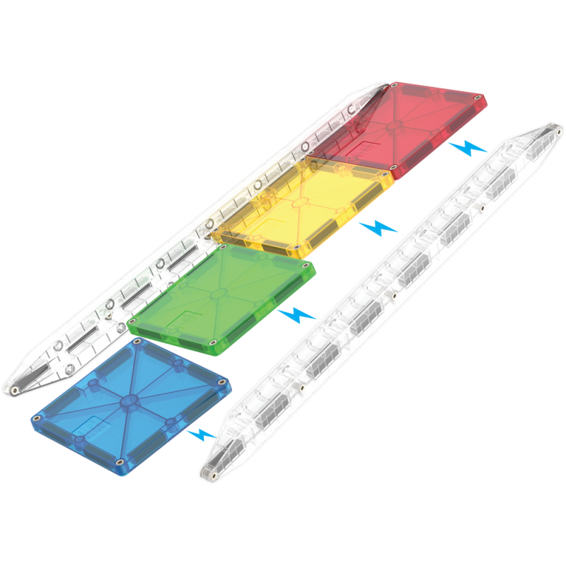 Prøv at blande de forskellige typer af Magna-Tiles, og lad dit barn eksperimentere med, hvad der kan lyses igennem med fx cykellygter, og hvad der ikke kan.