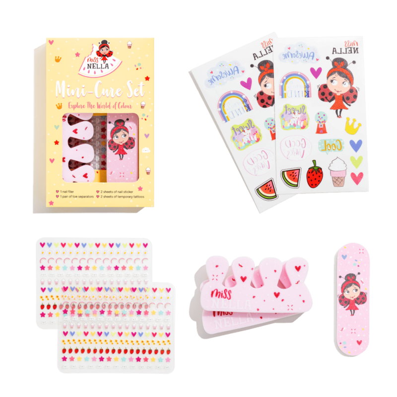 MiniCure negle- og accessories-sættet fra Miss Nella er skabt til børn, der elsker at lege med farver og mønstre. Sættet indeholder alt, hvad der skal bruges til en sjov og kreativ lille manicure: en neglefil, tåskillere, farverige negleklistermærker og midlertidige tatoveringer.