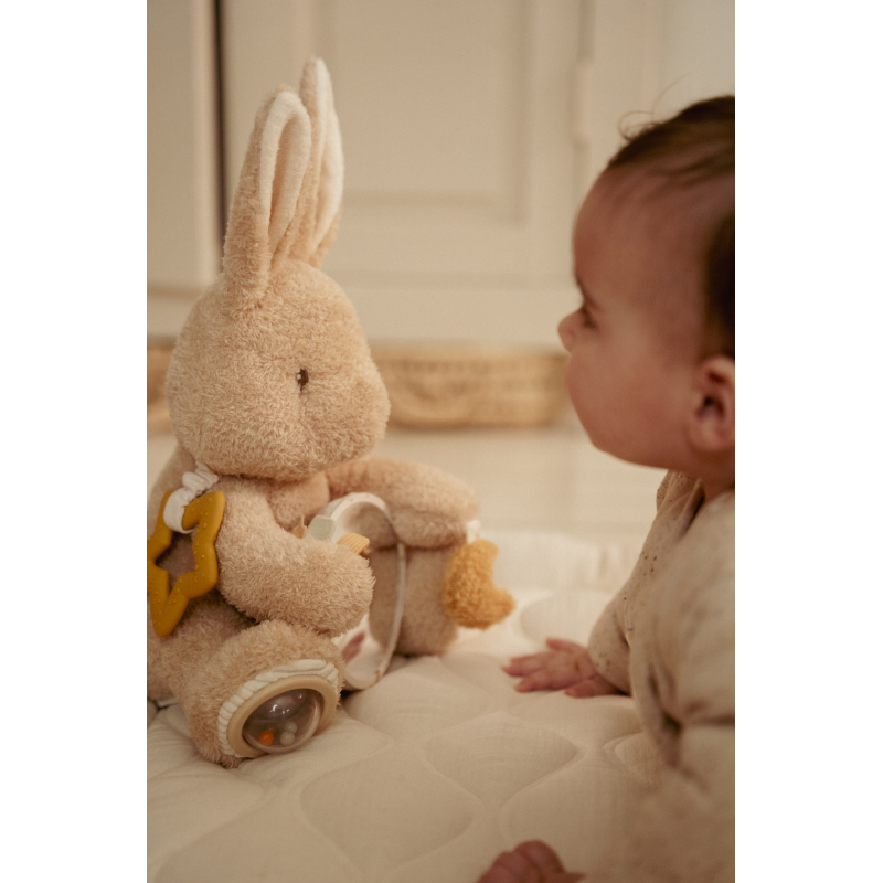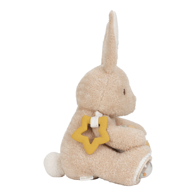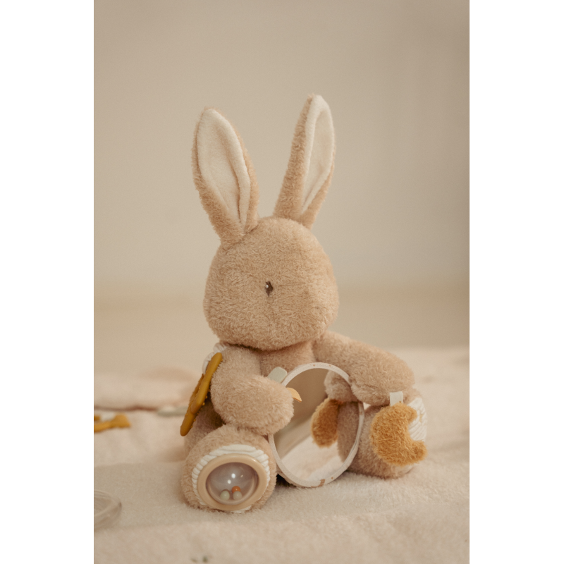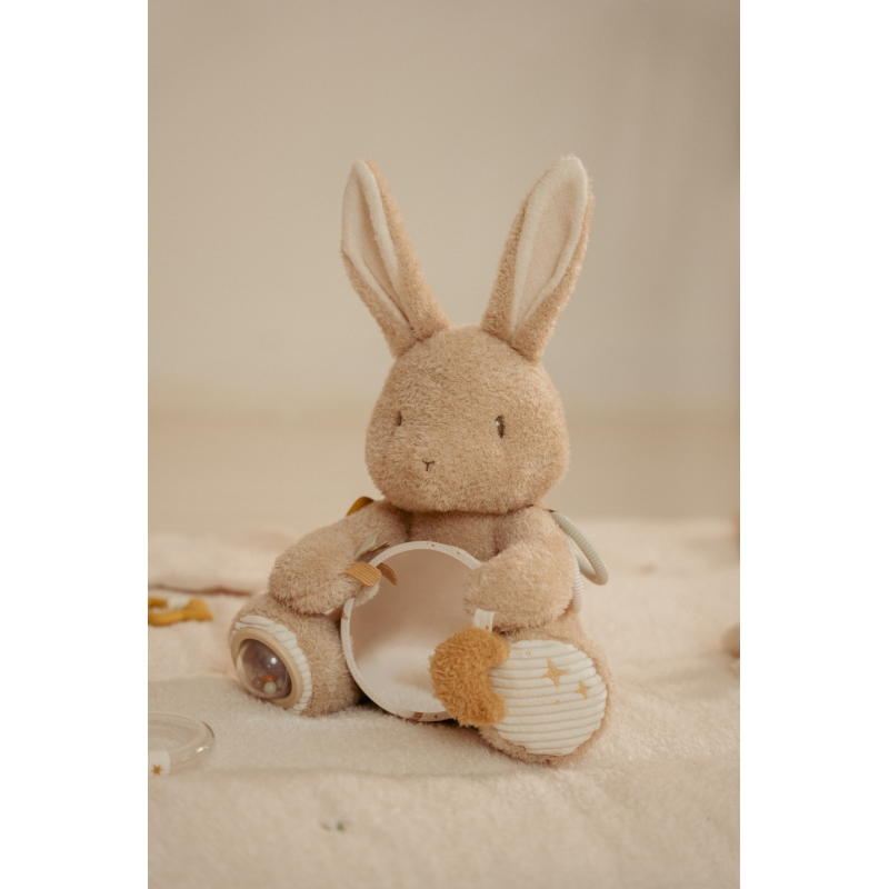 Den er lavet af polyester og er lige til at kramme. Den er udstyret med rangle, bidering, knitrelyd, nulrebånd & spejl. Masser for baby at gå på opdagelse i.