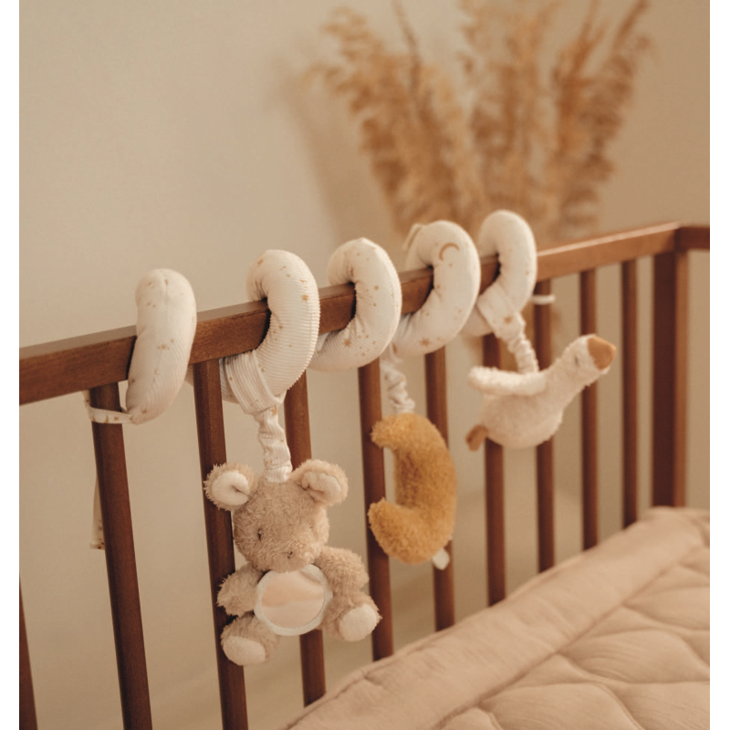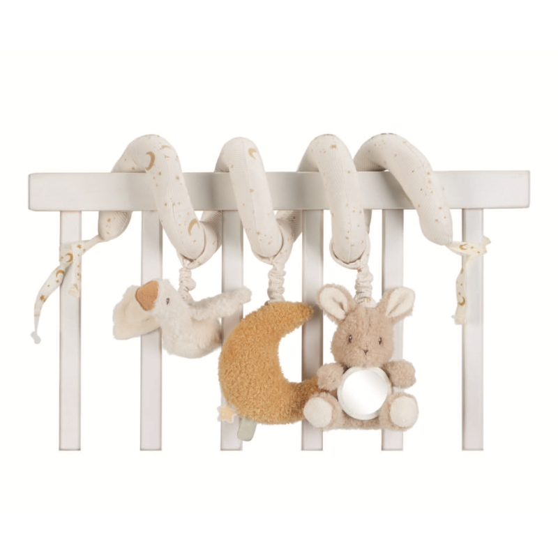 Den sjove og engagerende aktivitetsspiral vil underholde babyer både hjemme og på farten. Fastgør nemt aktivitetsspiralen til alt fra tremmesenge til kravlegård, klapvogn eller autostol. Aktivitetsspiralen udfordrer sanserne og stimulerer hånd-øje-koordinationen. Aktivitetsspiralen er lavet i blødt fløjl og er udstyret med en sødt kanin, fin fugl samt en flot måne, der nok skal begejstre baby!