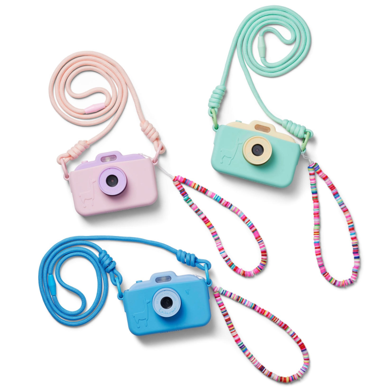Lalarma kameraet findes også i gule/mint og lyserøde varianter – så der er en farve til enhver lille fotograf med store drømme. 🌈