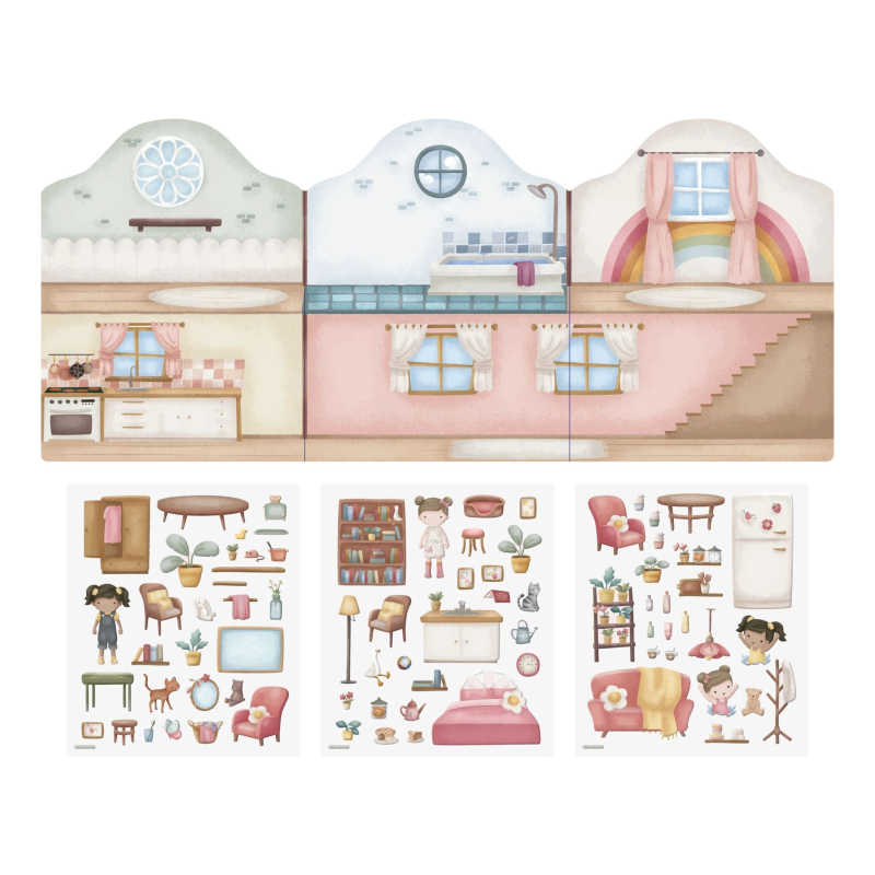 Klistermærkebogen indeholder 60 genanvendelige klistermærker med fantastisk interiør, der giver alle muligheder for at indrette Rosa's hus!. Når barnet hygger sig med bogen trænes både finmotorik, kreativitet og koncentration.