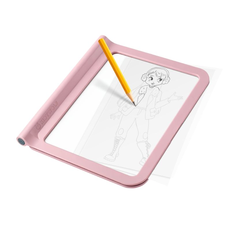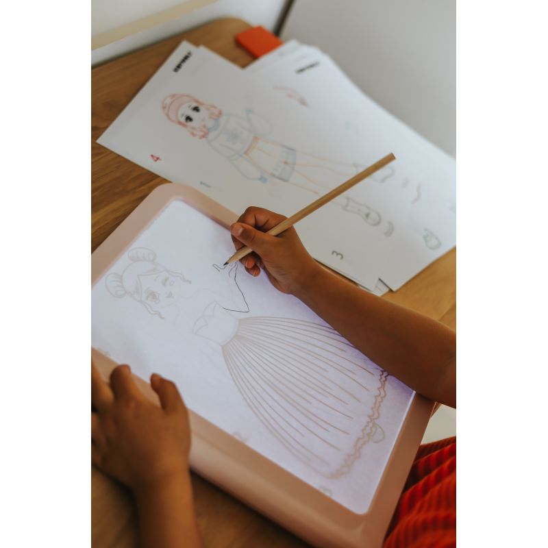 Den smarte lysplade fungerer som et lille designbord, hvor de medfølgende skabelonark og neonfarvede tuscher giver mulighed for at eksperimentere med lag, gennemsigtighed og lyseffekter. Den bløde, hvide LED-skærm har tre lysstyrker, så tegningerne står tydeligt frem både dag og nat.