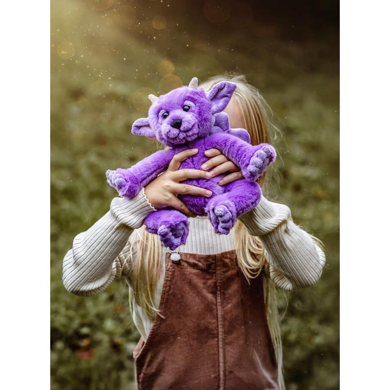 Den dybe lilla pels er silkeblød og giver et eventyrligt skær, mens de små horn, vinger og nænsomme detaljer fuldender hans fortryllende udtryk. Han er perfekt til kram, til at vogte over nattetimerne og til at inspirere til timevis af leg og fantasi. Når han trænger til en opfriskning, kan han vaskes i maskine – og bliver hurtigt klar til nye eventyr.