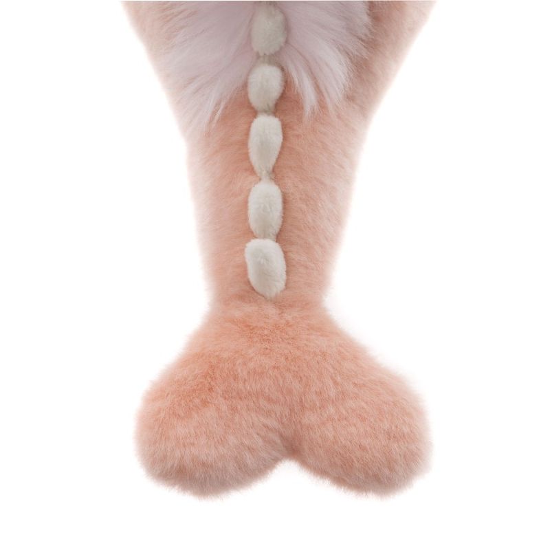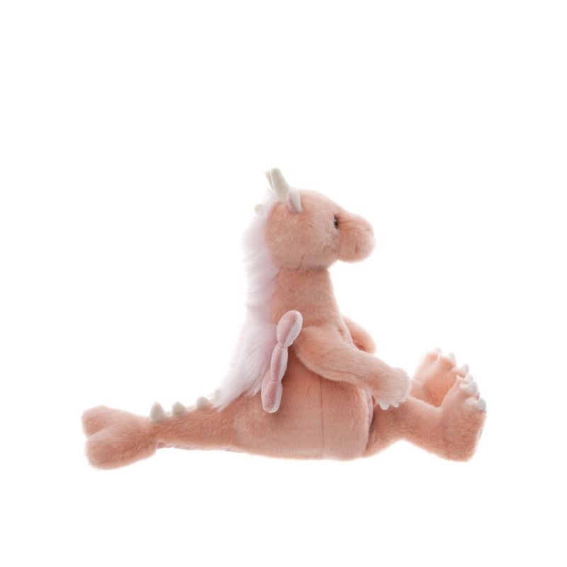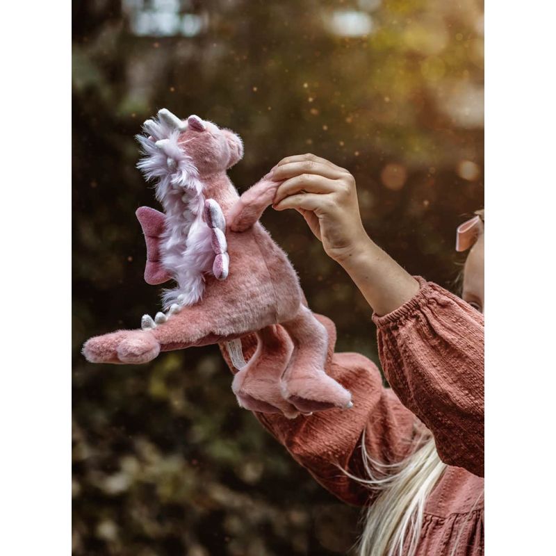 Hendes pels er blød som candyfloss i sarte rosa nuancer, og de små vinger, kløer og horn giver hende et fortryllende udtryk, der vækker nysgerrighed og varme. Hun er perfekt formet til små hænder, der vil kramme, lege og drømme – men hun pynter også smukt som en del af en samling for dem, der elsker blødt håndværk og eventyrlige figurer.