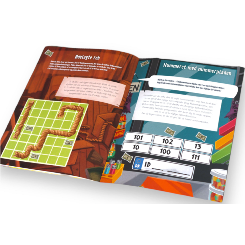 Undervejs møder barnet alt fra skjulte mønstre og koder til visuelle gåder, logiske udfordringer og små mysterier, der kræver opmærksomhed og snilde. Opgaverne løses ved hjælp af de medfølgende stickers, som gør det ekstra sjovt at åbne nye spor og færdiggøre missionen. Når barnet placerer det rigtige klistermærke, sker der noget i historien – som et lille escape room i bogform, hvor alle detaljer tæller.