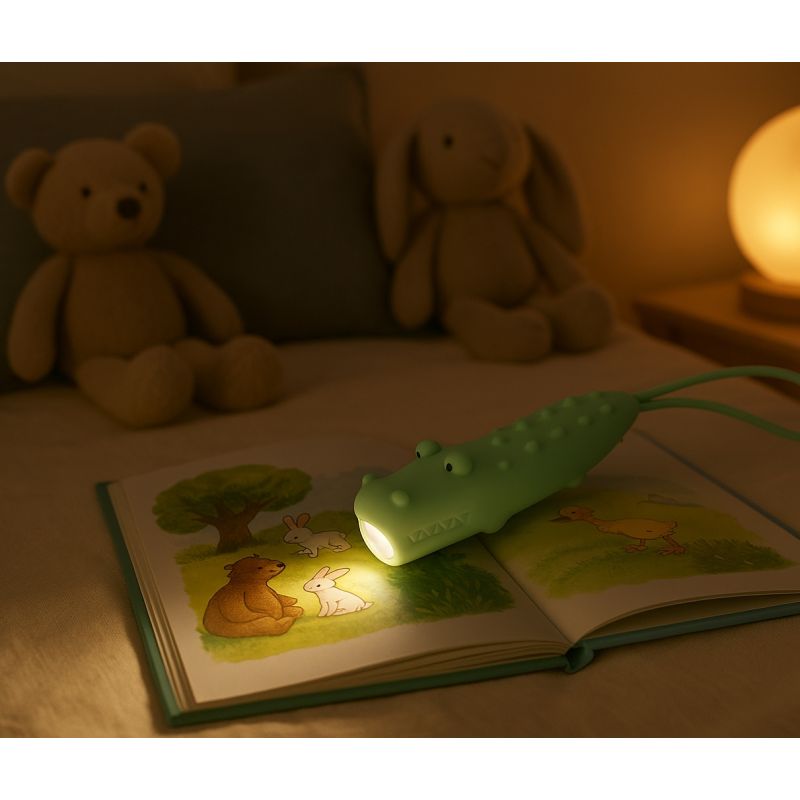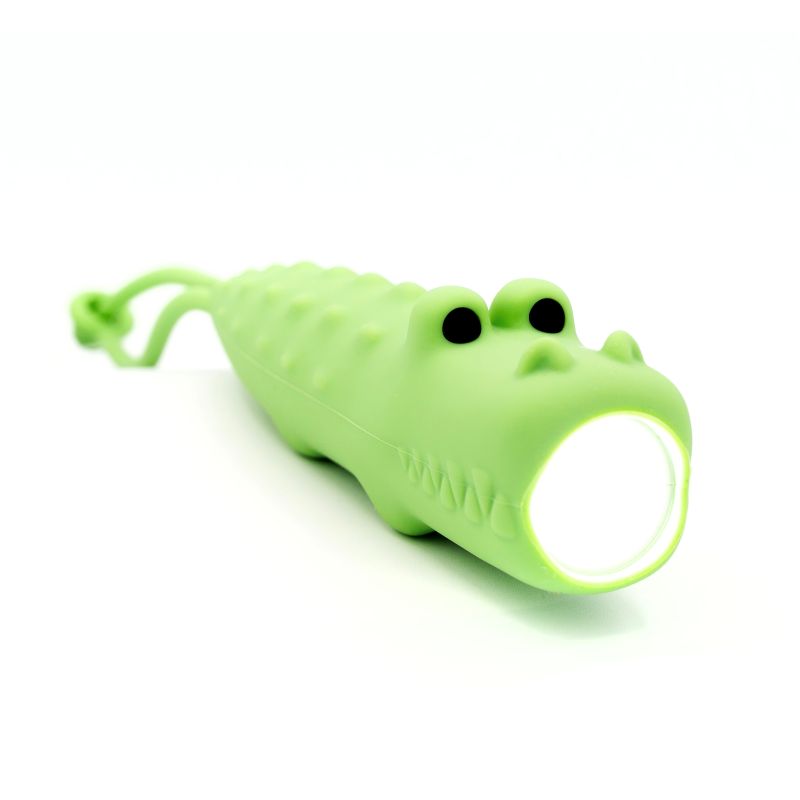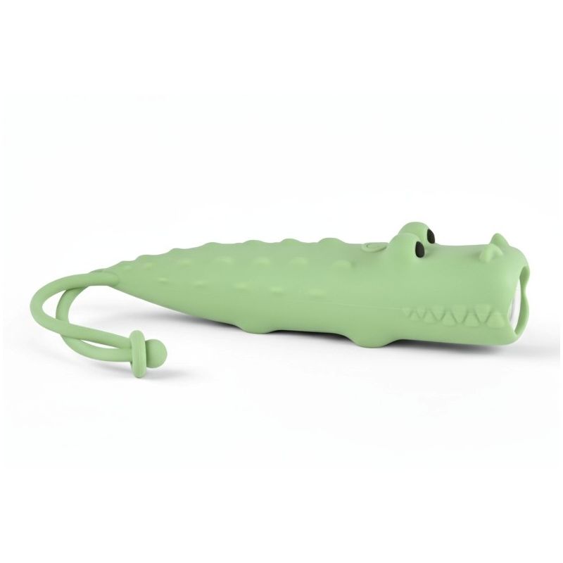 Den fleksible silikone gør lommelygten modstandsdygtig over for snavs, små stød og lidt regn, så den er oplagt til både udendørs lege, hulebyg i stuen og hyggelige aftenture. Den bløde bærerem gør det nemt for barnet at tage krokodillen med sig overalt – fra ferier til weekendture hos bedsteforældre.