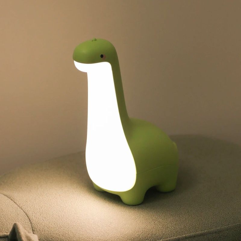Langhals dinosaur tilbyder forskellige lyseffekter. Lampen oplades nemt via USB, ca. 3 timer, og er genopladelig, hvilket gør den både miljøvenlig og praktisk i hverdagen.