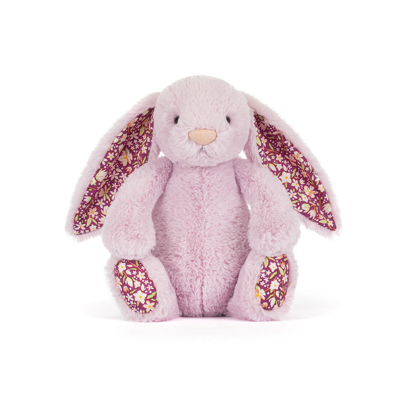 Denne fine Tristlepop Blossom Luxe kanin er lavet i en flot lyslilla farve med blomstret stof i ører og poter. Kanin bamsen er fantastisk blød, ørerne er gode at holde om, og nulre med, og så er den udstyret med en flot hvid hale.