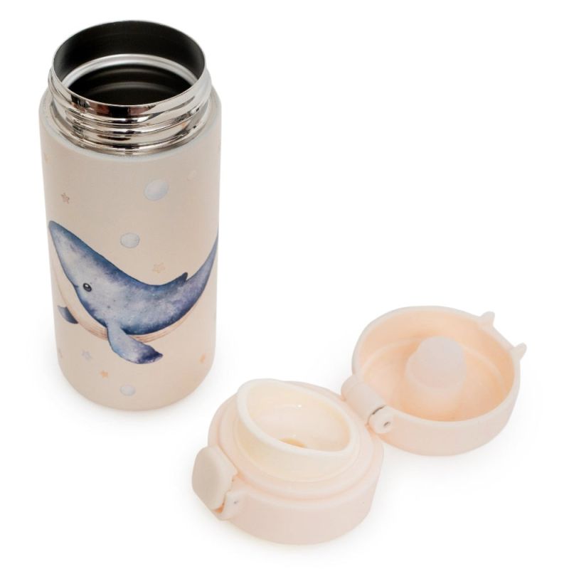 En fin og funktionel drikkedunk med den sødeste lille hval, der svømmer roligt hen over den lyse baggrund omgivet af små bobler og stjerner. Illustrationens bløde blå nuancer og varme detaljer skaber et roligt og drømmende univers, som gør hver tår vand til en lille stund fyldt med fantasi.
