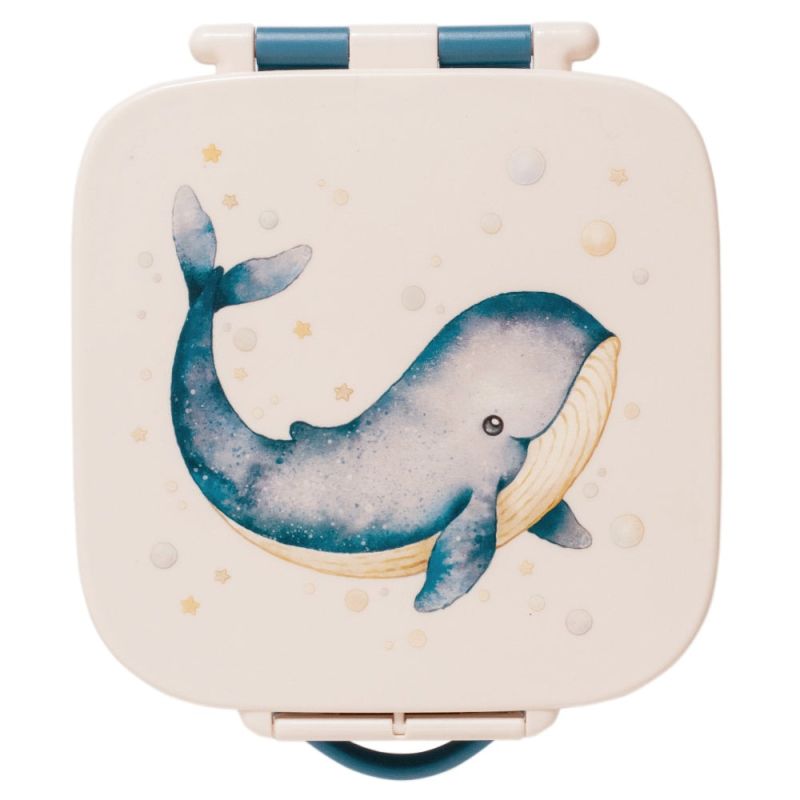 En sød og praktisk bento madkasse til børn med den fineste lille hval, der svømmer mellem stjerner og bobler på låget. Den blide cremefarve kombineret med den dybe blå bund skaber et roligt, nordisk udtryk, som gør madpakken ekstra hyggelig at åbne i børnehave, skole eller på tur.