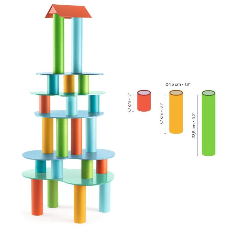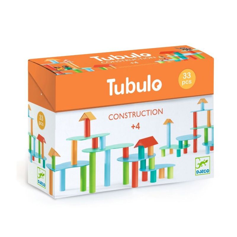 Tubolo konstruktionsleg fra Djeco er et farverigt og anderledes byggesæt, hvor barnet kan skabe fantasifulde konstruktioner med rør og organiske plader. I stedet for klassiske firkantede klodser består Tubolo af solide cylinderrør i forskellige højder og brede, bløde platforme, der kan stables, kombineres og balanceres i utallige formationer.