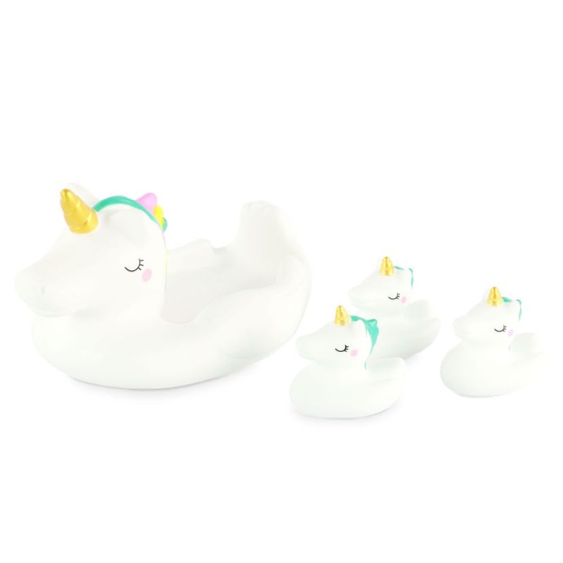 Badetid bliver hurtigt til en magisk lille eventyrstund med denne søde enhjørningefamilie. Den store enhjørning flyder roligt på vandet, mens de tre små føl kan sejle ved siden af, gemme sig i mors ryg eller tage på deres egne små badeeventyr i badekarret.