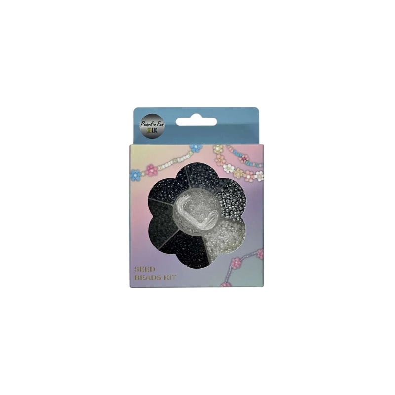 De mindste perler giver de smukkeste resultater! Dette Seed Beads Kit fra Pearl'n Fun er en blomsterformet kasse med mini glasperler i skønne farver i Sort, grå & hvide nuancer –samt elastik tråd i midten så man er klar til at gå i gang med det samme.