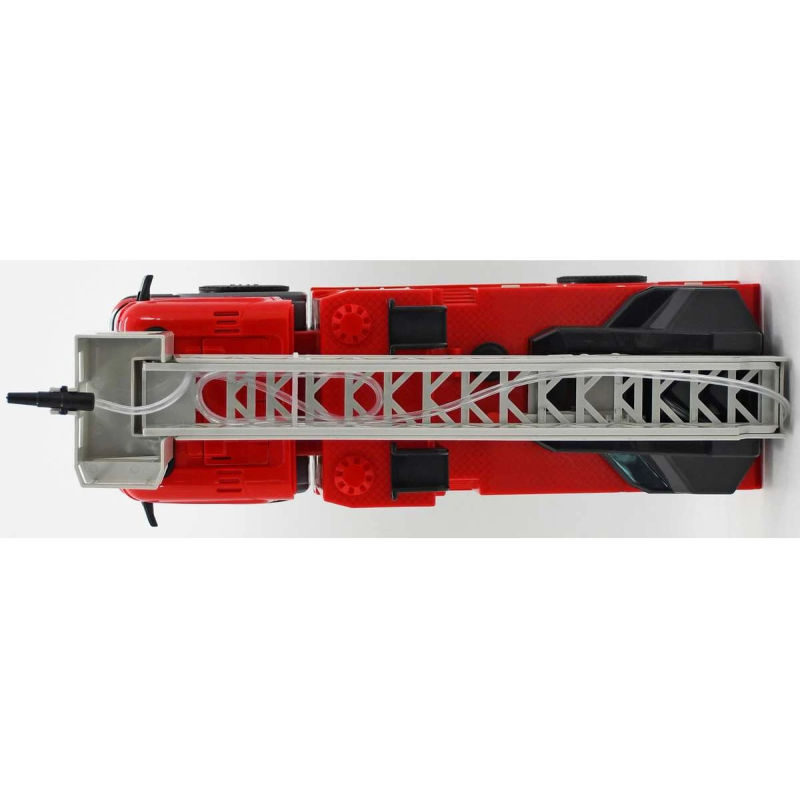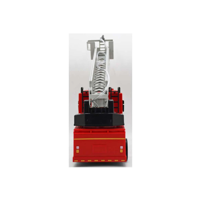 Stigen på taget kan køres helt ud i fuld længde og er monteret med en rigtig vandslange – for med den medfølgende vandbeholder kan der faktisk hældes vand i bilen, som så pumpes ud gennem slangen så den virkelige brand kan slukkes. Det er den slags funktion der gør øjnene store og legen intens. Derudover har brandbilen friktionsdrev så den ruller afsted med et skub, blinkende lys på taget og realistiske lydeffekter der aktiveres via to trykknapper på bilen.