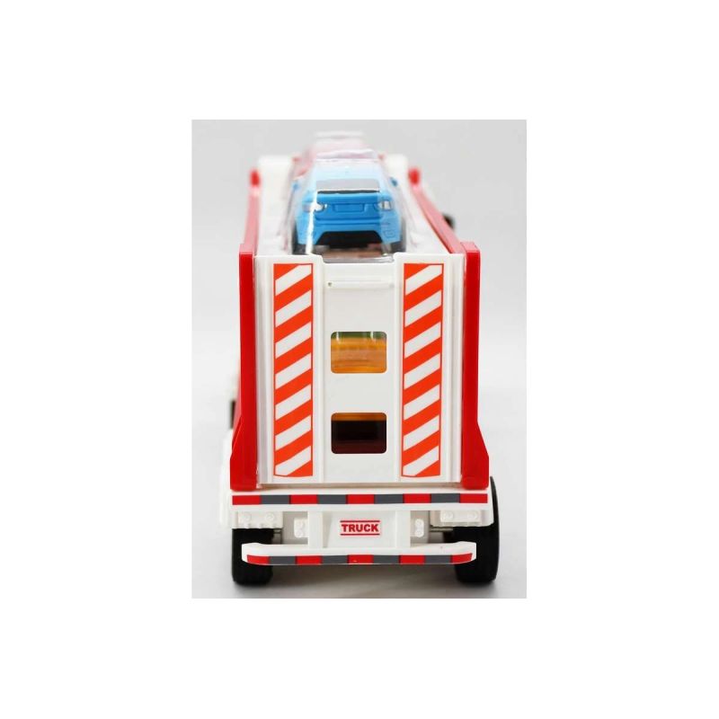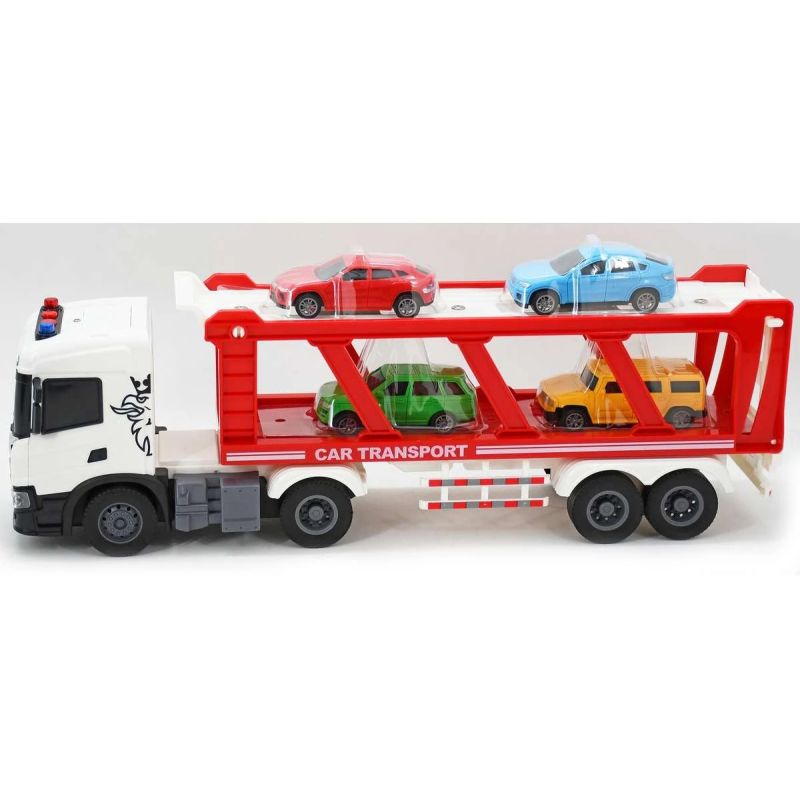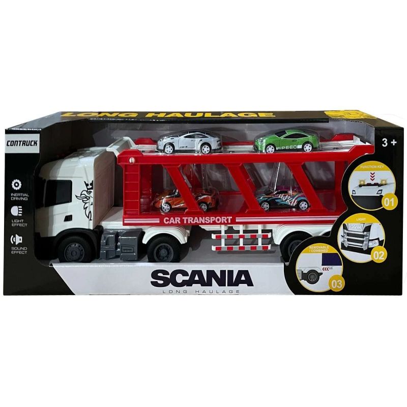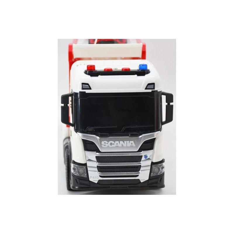 Denne seje SCANIA licens lastbil kommer med en lang hænger i 2 etager samt 4 mindre biler. Hængeren har en praktisk bagampe, der kan sænkes, så biler nemt kan køre op på ladet og ned igen. Det samme er gælende for hængernes øverste etage, der også kan sænkes helt ned til bagramen samt hæves igen. Hængeren kommer samtidig med støtteben, der kan sænkes, så den ikke vælter, når den er afmonteret fra førehuset.
