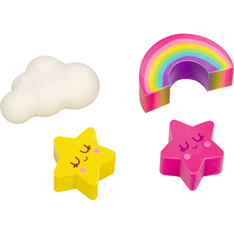 Sættet indeholder fire forskellige viskelædere – to stjerner, en sky og en regnbue – som både visker godt og indbyder til små lege i pauserne. De passer perfekt i penalhuset og er nemme at have med i skole, til tegnetid derhjemme eller på tur. Det søde design gør dem også oplagte som en lille gave, kalendergave eller som en fin overraskelse til barnet, der elsker regnbuer og eventyrlige detaljer.