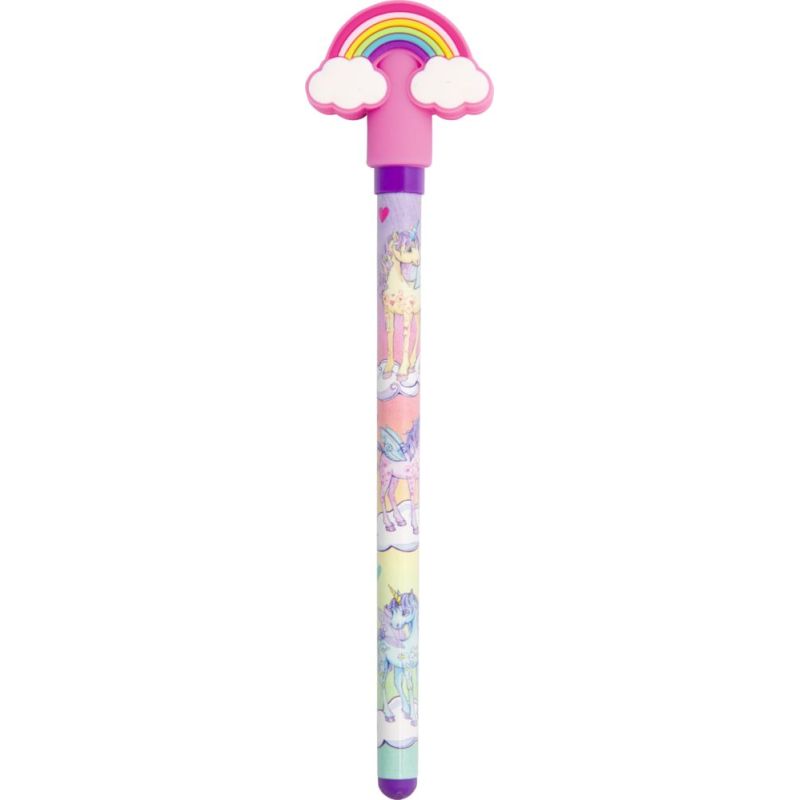 En farverig gelpen, der gør hver eneste tegning og skriveopgave lidt mere eventyrlig. Den fine pen er pyntet med et sødt enhjørningemotiv og en glad regnbue på toppen, som straks bringer smil frem og giver lyst til at skrive, tegne og udfolde fantasien. Den regnbuefarvede blæk skaber magiske streger på papiret og gør selv små noter og tegninger til noget helt særligt.