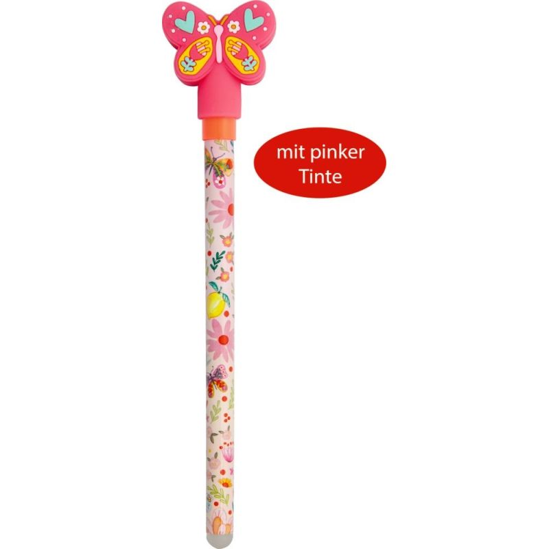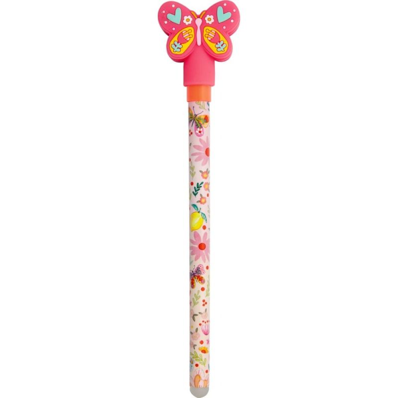 En farverig gelpen, der gør hver eneste tegning og skriveopgave lidt mere eventyrlig. Den fine pen er pyntet med et sødt sommerfugle/blomster motiv og en glad sommerfugl på toppen, som straks bringer smil frem og giver lyst til at skrive, tegne og udfolde fantasien. Det neonpink farvede blæk skaber magiske streger på papiret og gør selv små noter og tegninger til noget helt særligt.