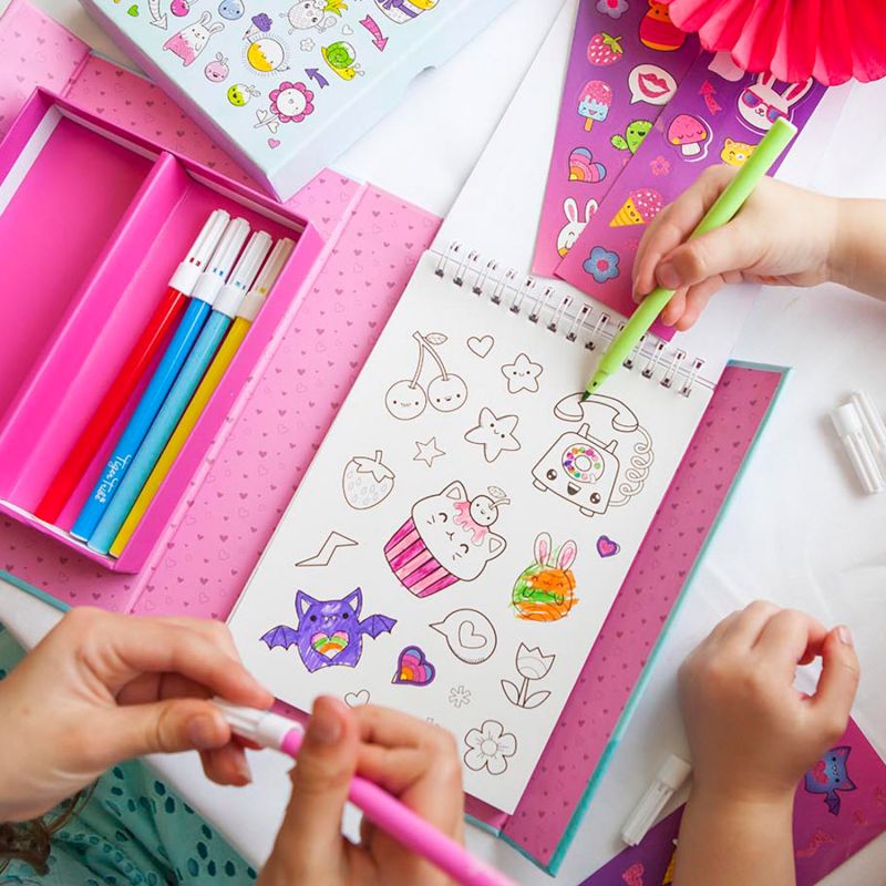 Et fantasifuldt og kreativt sæt, hvor barnet kan farvelægge, tegne og dekorere med masser af søde motiver og farverige detaljer. Her åbner der sig en verden af små figurer, dyr, is, blomster og finurlige illustrationer, som inviterer til fordybelse, leg og kreativ udfoldelse. Den medfølgende maleblok giver barnet mulighed for at slippe fantasien løs og skabe egne små kunstværker, som bagefter kan pyntes med de mange klistermærker.