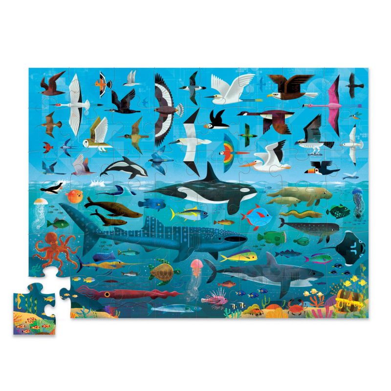 Dette fascinerende puslespil fra Crocodile Creek inviterer barnet på en spændende opdagelsesrejse, hvor verden over havets overflade og livet under vandet mødes i ét stort og detaljerigt motiv. Mens brikkerne samles, kan barnet udforske fuglene, der svæver højt på himlen, og samtidig opdage de mange havdyr, der gemmer sig i dybet. Det skaber en følelse af undren og nysgerrighed og giver en sjov introduktion til naturens mangfoldighed.