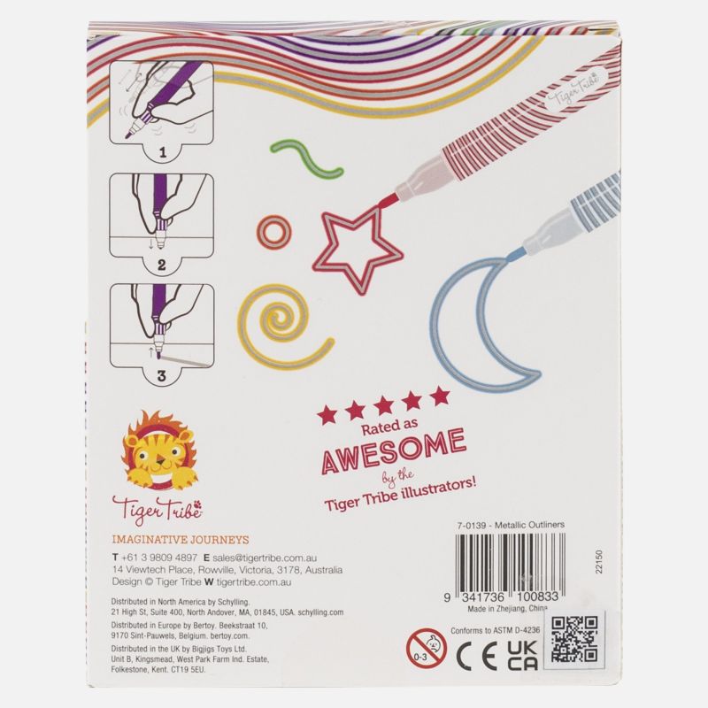 8 metallic outliner tuscher med dobbelt farveeffekt. Giver en funklende sølvfarve med farvet kant i én streg. Hurtigttørrende, lugtfri og uden skadelige stoffer. Kan anvendes på papir samt materialer som sten, træ og glas. Anbefales til børn fra 5 år.