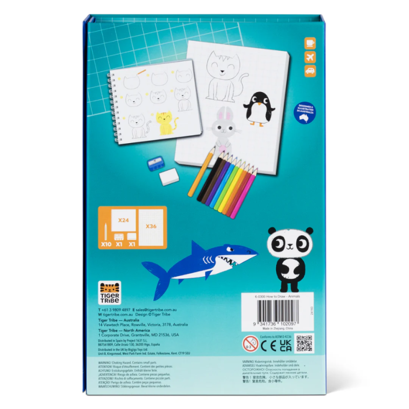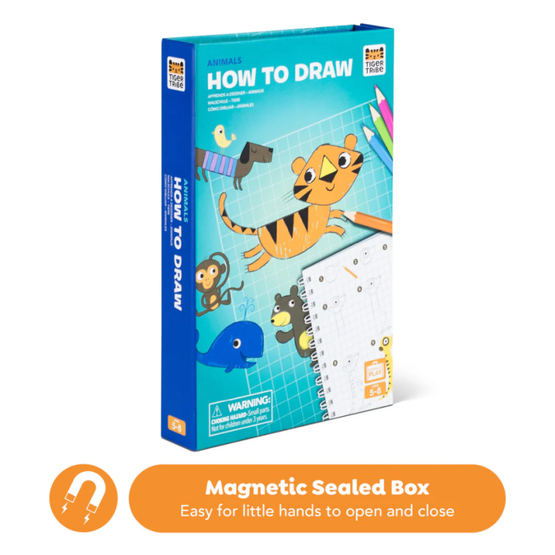 Med dette fine tegnesæt fra Tiger Tribe bliver det både sjovt og overskueligt for barnet at lære at tegne søde og sjove dyr. Trin for trin viser de enkle illustrationer, hvordan en lille streg langsomt forvandles til en tiger, en hval, en panda eller en legesyg abe. Barnet oplever hurtigt succes og får lyst til at tegne igen og igen, mens fantasien folder sig ud og dyrene får deres helt egne udtryk og personligheder.