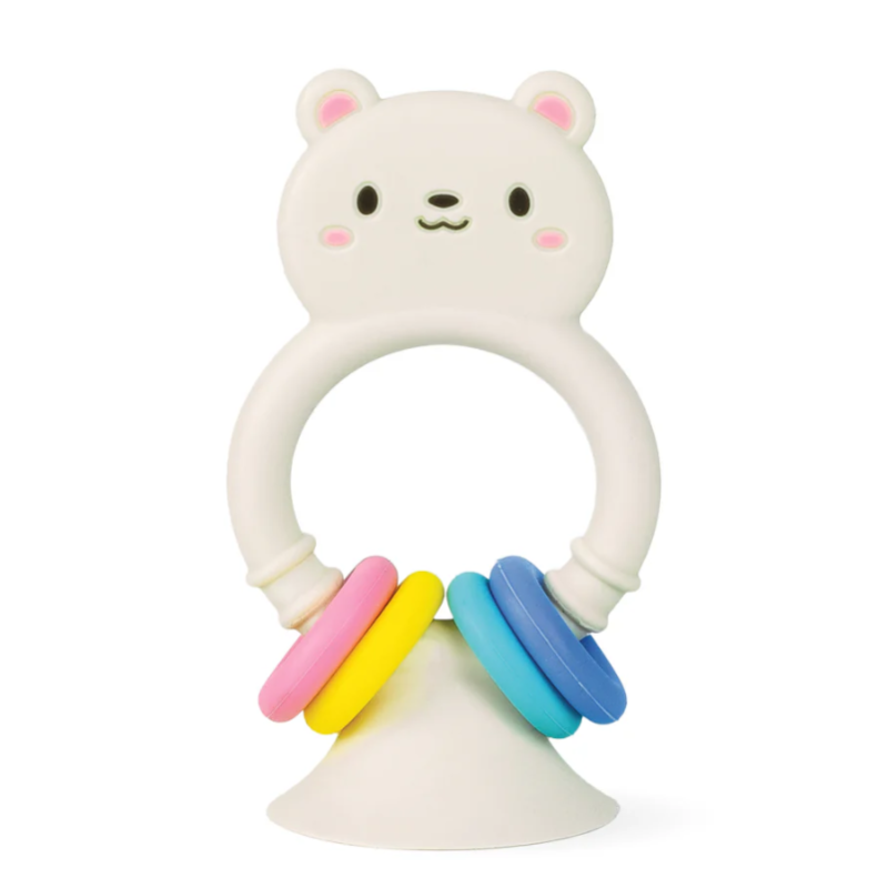Den bløde silikone er skabt til små hænder og ømme gummer og gør bjørnen til en oplagt følgesvend, som kan tages op igen og igen. Den behøver ikke sidde fast hele tiden – den kan ligge i hænderne, blive bidt i, komme med på tur i klapvognen eller være en hyggelig aktivitet på farten. De farverige ringe inviterer til at dreje, trække og undersøge, og gennem legen styrkes både finmotorik, hånd-øje-koordination og forståelsen for årsag og virkning.