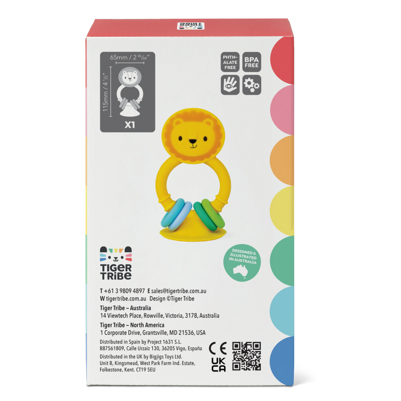 Den bløde silikone gør løven behagelig at holde om og ideel at bide i, når tænderne er på vej frem. Den behøver ikke sidde fast hele tiden – den kan nemt tages op, ligge i hænderne, komme med på tur i klapvognen eller være en tryg ledsager på farten. De små farverige ringe inviterer til at dreje, trække og undersøge, og gennem legen styrkes finmotorik, hånd-øje-koordination og forståelsen for årsag og virkning.