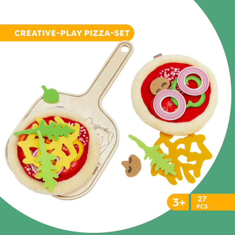 Den bløde pizza er delt i forskellige dele og er sat sammen med velcrobånd. De 2 Pizzabunde dekoreres med de medfølgende grøntsager: 3 salamiskiver, 3 tomatskiver, 3 basilikumblade, 3 rucoloblade, 3 løgringe, 4 champignoner, 3 peberfrugt skiver samt 2 skiver revet ost.