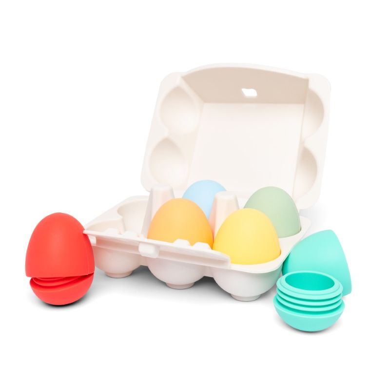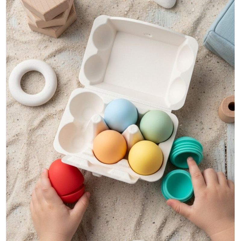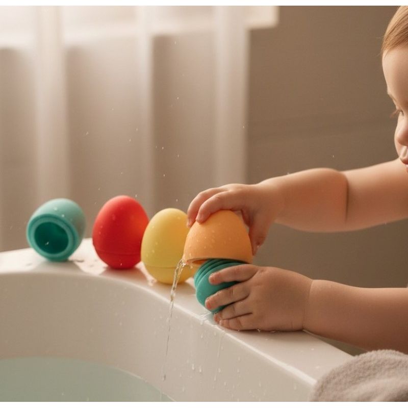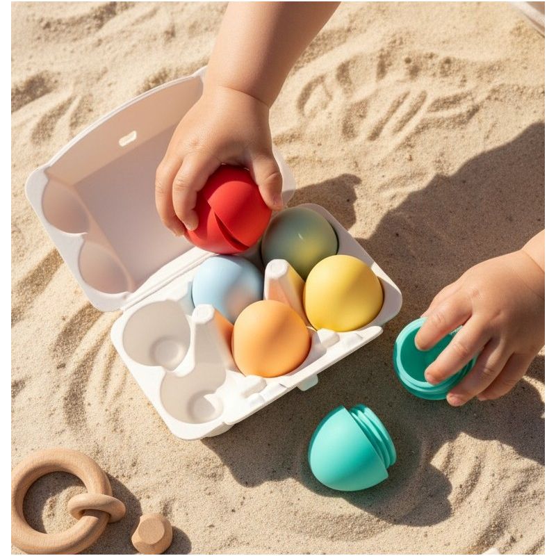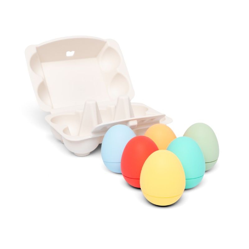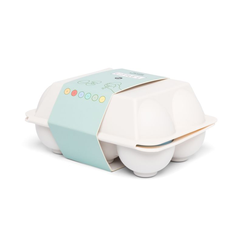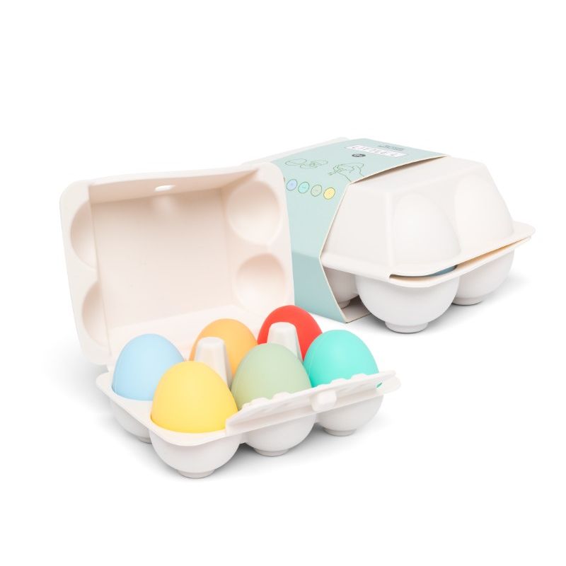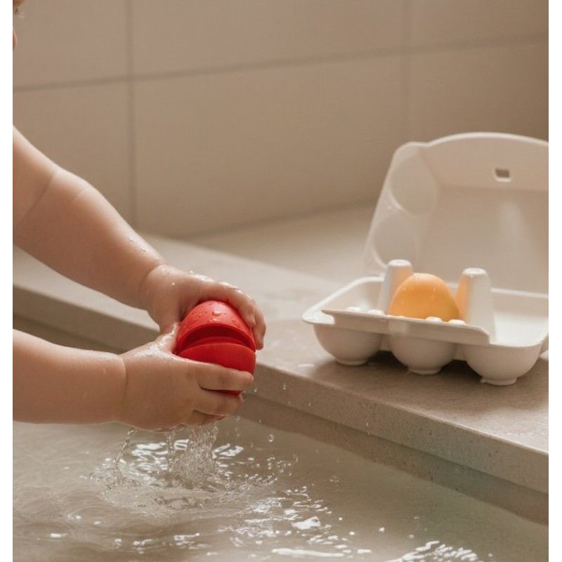 Badeæggene er fremstillet i blød og sikker silikone, som er fødevaregodkendt og behagelig at røre ved og bide i. Derfor kan de også bruges som bidelegetøj, når gummerne klør, samtidig med at legen styrker finmotorik og håndstyrke. De lette former gør dem nemme for små hænder at gribe, stable, sortere og samle igen i den fine æggebakke, som inviterer til leg både i og uden for vandet.