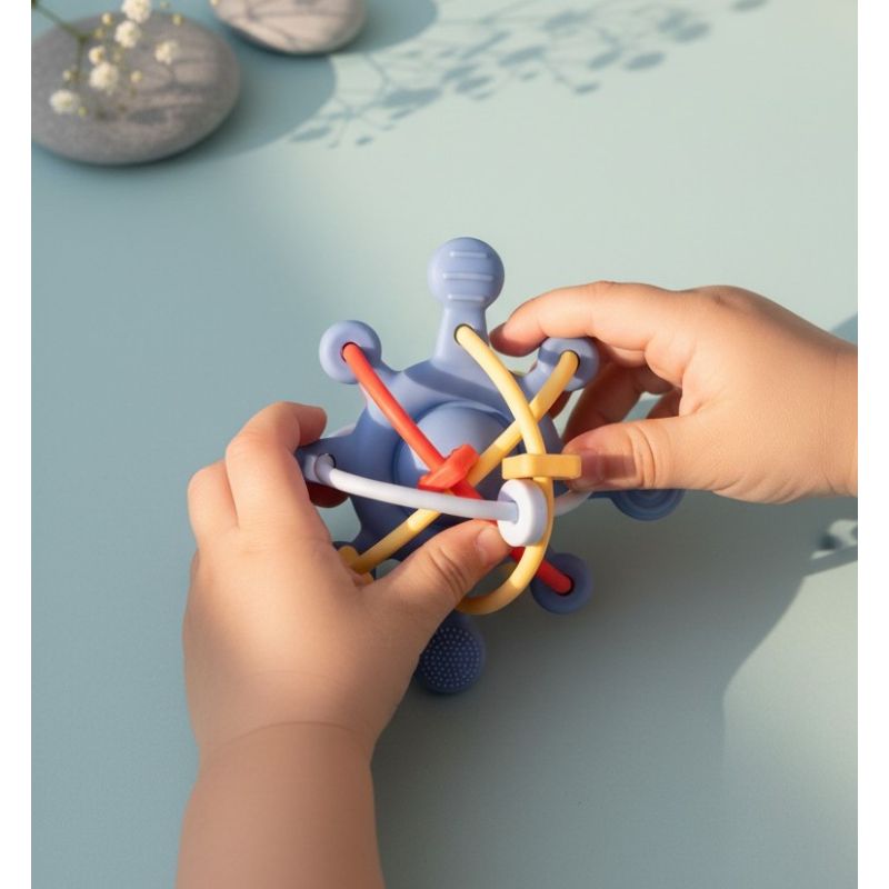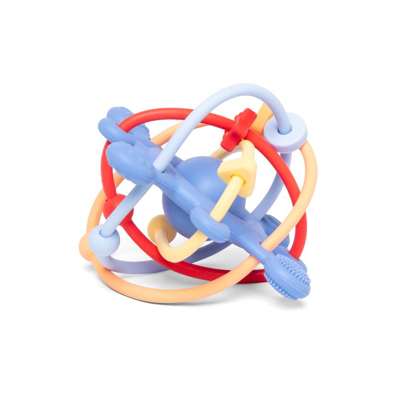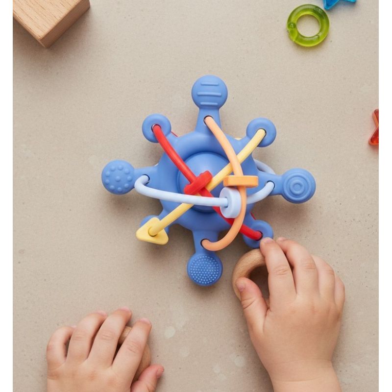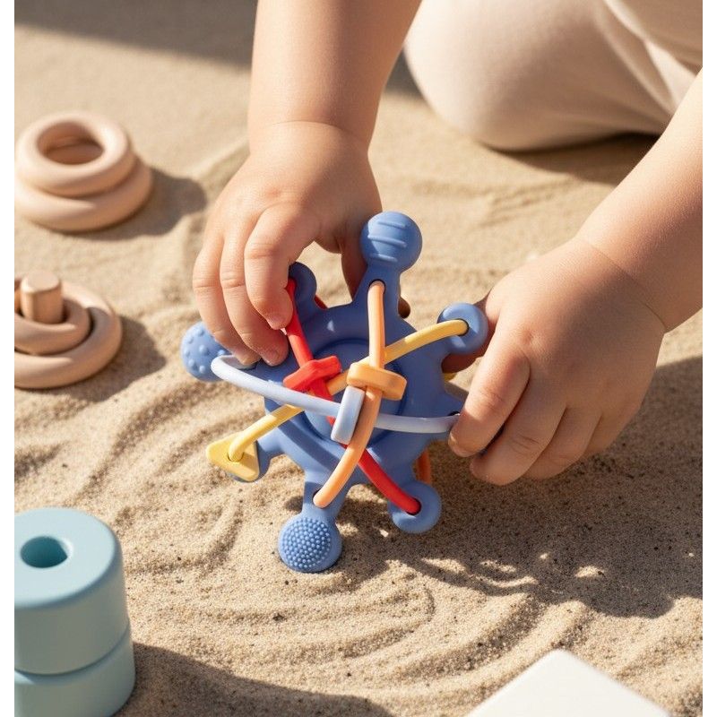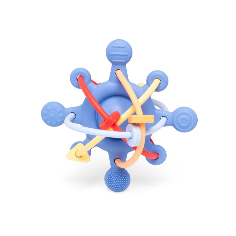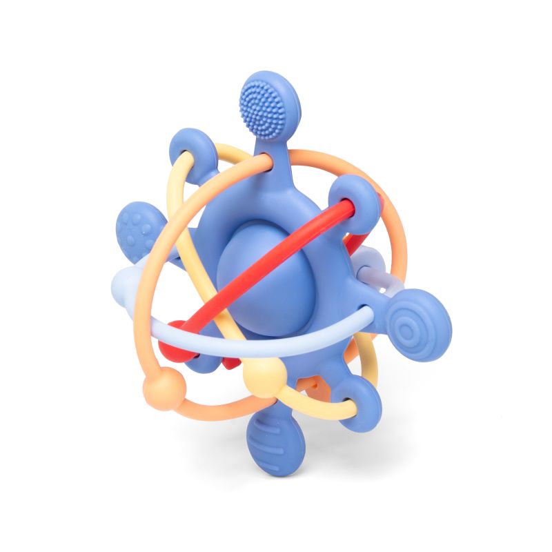 Legetøjet er fremstillet i blød og sikker silikone, som er fødevaregodkendt og særligt behagelig at røre ved og bide i. Derfor fungerer det perfekt som bidelegetøj, når gummerne klør, og samtidig som sensorisk legetøj, der giver tryg og beroligende stimulation. Den runde form gør det nemt for små hænder at gribe fat, trykke, trække og udforske fra alle vinkler, og legetøjet kan vaskes i opvaskemaskinen, så det altid er klar til næste legestund.