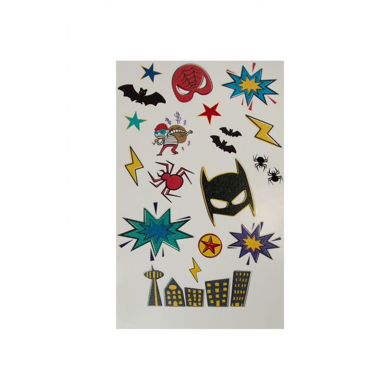 Disse fine tatoveringer er oplagt til barnet, der elsker superhelte. Tatoveringer er lette at få af med vand og sæbe.
