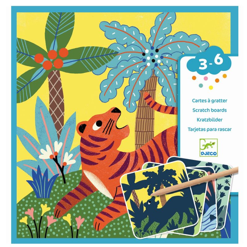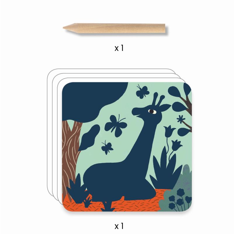 Dette kreative sæt indeholder 4 skrabekort med motiver af flotte store dyr samt en træpind til at kradse motiverne frem på kortene.