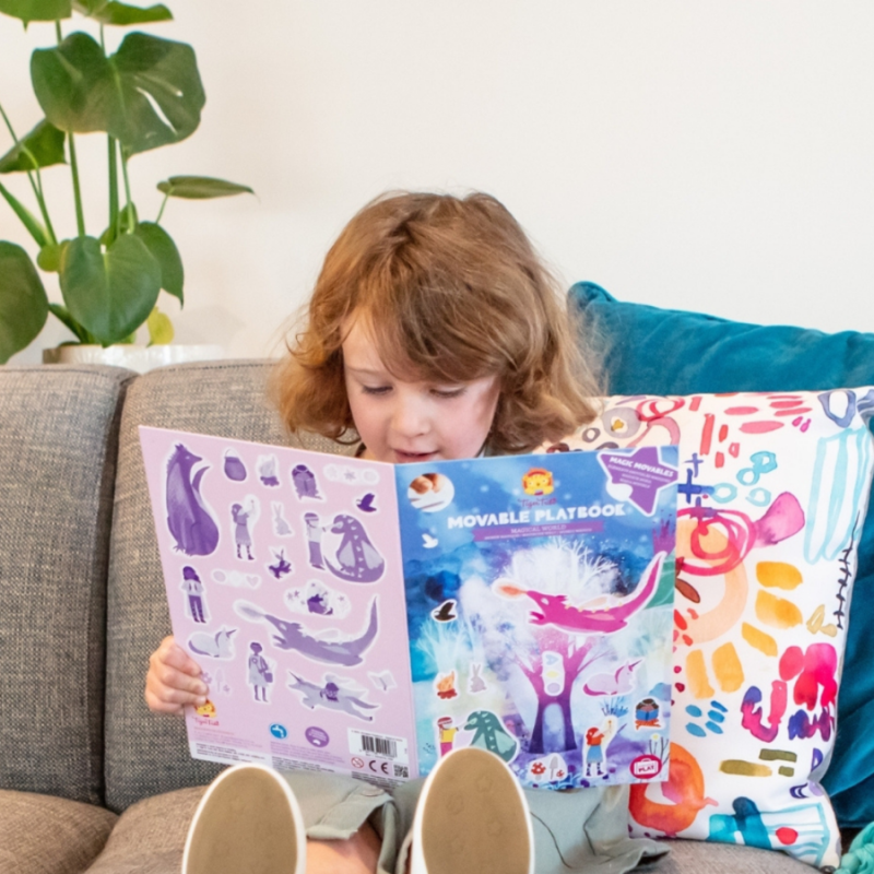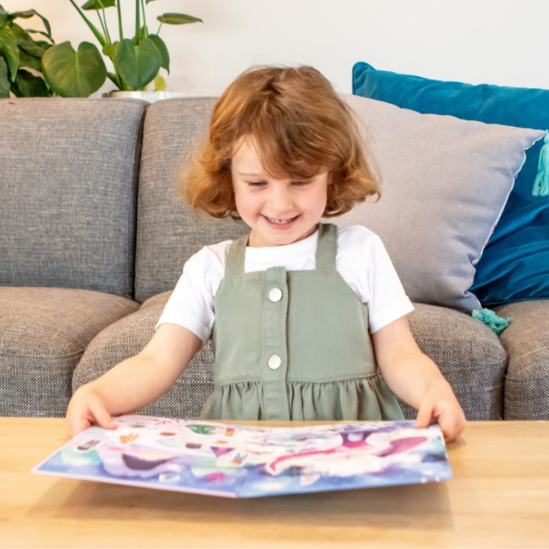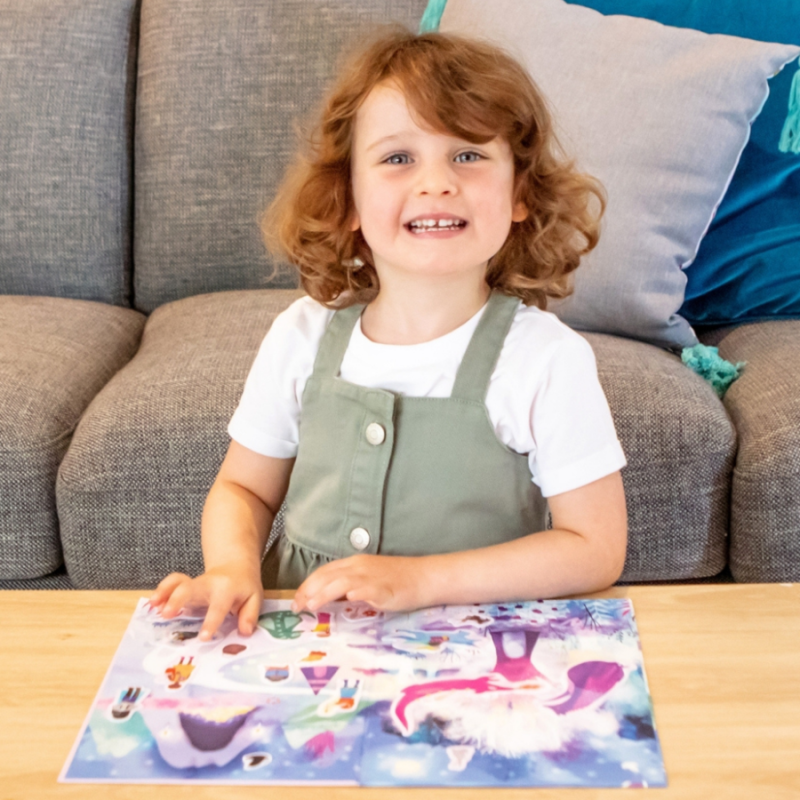 Brug de genanvendelige silikoneklistermærker til at skabe et nyt billede hver gang på den udfoldede afspilningsscene. Når du er færdig, skal du skrælle og klæbe for at fuldføre 'match it'-puslespillet på bagsiden.