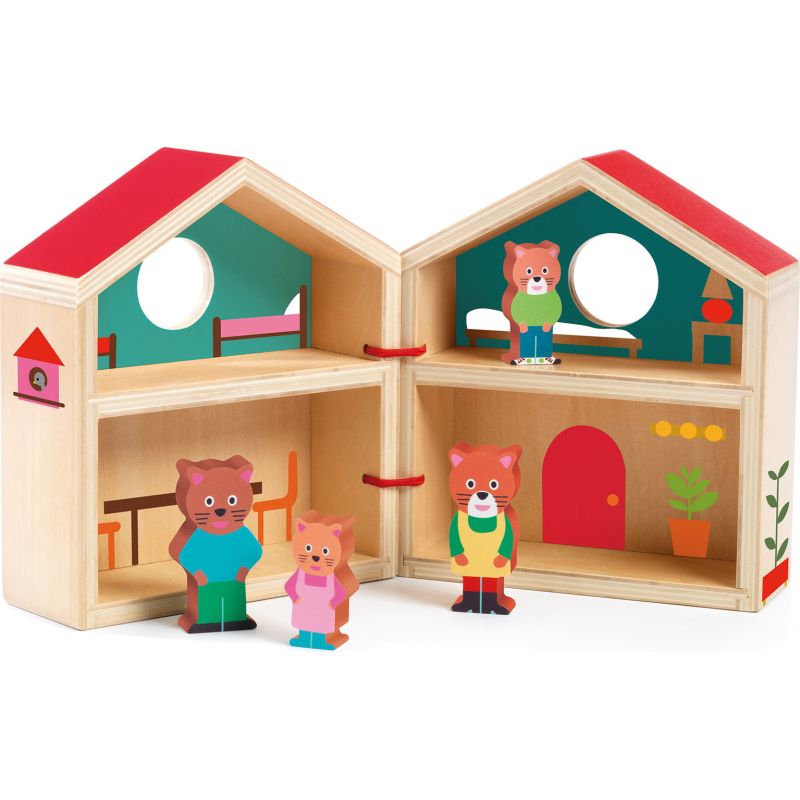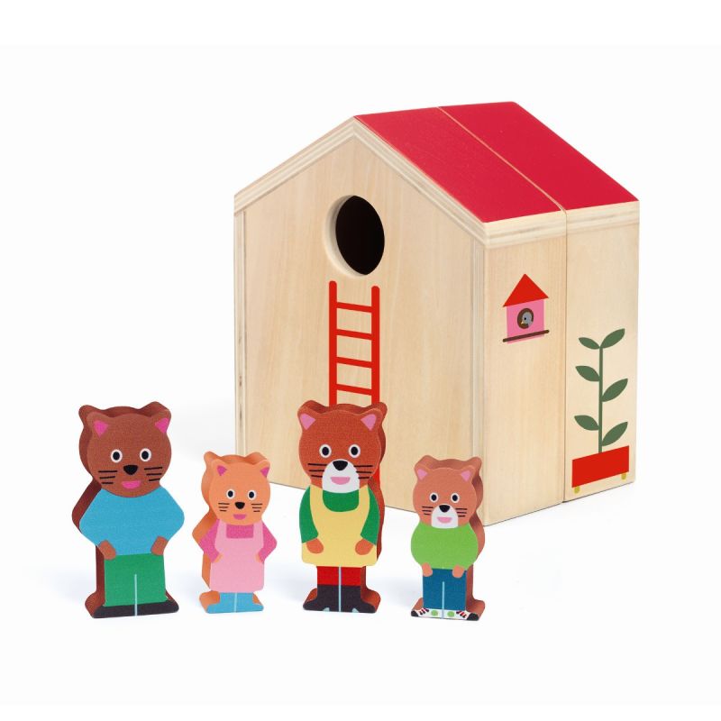 Det fine dukkehus i træ kan deles i 2 dele, så de 4 katte nemt kan komme ind og ud af huset. Huset kan åbnes og afslører to etager med fire værelser. Væggene har flotte farver med påmalede møbler. I killingernes soveværelse er et fint rundt vindue, som de frække killinger kan klatre ud af.