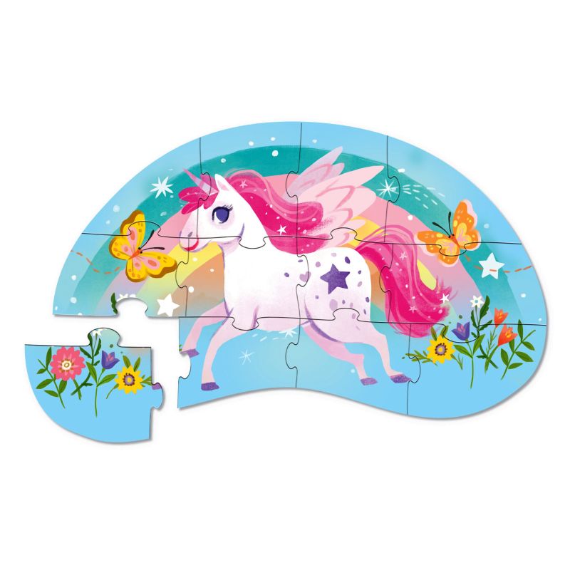 Et eventyrligt puslespil fra Crocodile Creek, hvor barnet kan træde ind i en magisk verden med en smuk enhjørning, farverige blomster og en regnbue fyldt med fantasi. De bløde former og klare farver inviterer til leg og fordybelse, mens barnet langsomt samler motivet og oplever glæden ved at få det hele til at passe sammen.