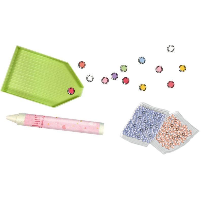 Her er en super gaveidé til det kreative barn, der elsker prinsesser. Her gives 4 flotte motiver med prinsesse Lillefe og hendes venner, der skal dekoreres med de 500 diamanter i forskellige farver. Der medfølger en bakke til diamanterne og en pen til påføring af diamanterne. Diamanterne er i plastik og motivarkene er i pap med selvklæbende overflade. Motiverne har et lille hul, så de han hænges op og pynte flot på værelset, når kunstværket er færdig.